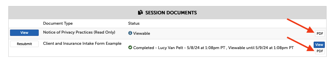 - Required pre-session: this document is required to be filled out and signed before the participant can enter the waiting room. If the participant clicks "Enter Waiting Room" with at least 1 required document not submitted yet, the video app will not launch; the participant will instead be redirected to the signing page.