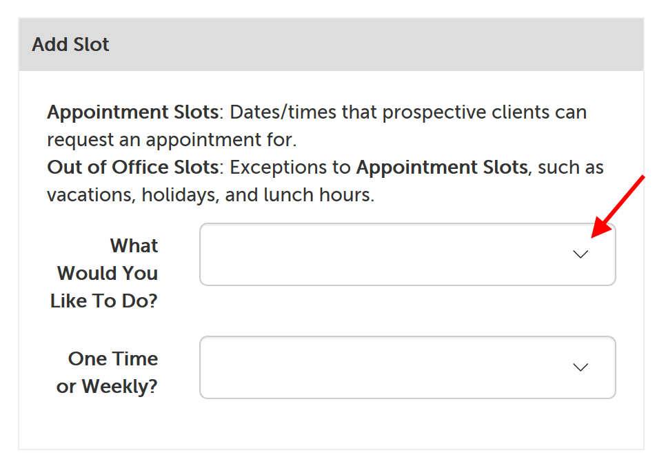 Appointment Slots allow you to list available dates and times on a public calendar, so that current and prospective clients can request a scheduled session, if the provider has the feature enabled. For a good overview of this feature, please see the video recording of a webinar we hosted on this type of virtual clinic.