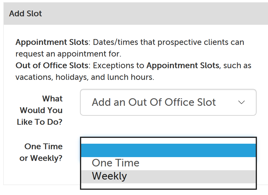 This support article will go over the process for adding out of office slots to your calendar, which are exceptions to any appointment slots you have already added (or may add) in the future. (If you use the Google Calendar or Microsoft Outlook calendar integrations, our system will already reference your other calendar for times that you have something else scheduled, so that it is not shown to potential participants. You will not need to add an out of office slot if that time is already blocked off in your connected Google or Outlook calendar.)