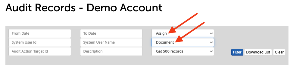 3. You will be able to view all Auditing activity from this page, but to view changes made to document associations (only) you will need to change the Action Type and the Action Target.